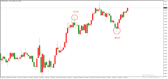 重要的阻力支撑位,笔者习惯使用分形指标来进行确认。有些人也会将分形指标叫做分型指标,后者来源于缠论。笔者所谓的分形与缠论的分型在K线数量要求上有所不同,所以命名上也有所差异。缠论讲分型指标由三根K线构成,笔者所讲分形指标由五根K线构成。如下图: