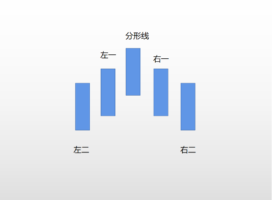 当中间的K线最高点高于左右各两根K线的最高点,则构成顶分形;当K线最低点低于左右各两根K线的最低点,则构成底分形。顶分形代表阻力位,底分形代表支撑位,它们都符合文首所提到的阻力支撑通俗定义。上涨波段和下跌波段的循环,实际就是顶分形和底分形的循环。底分形出现之后,预示未来将出现上涨波段;顶分形出现之后,预示未来将出现下跌波段。更详细的命名规则是:一个分形由五根K线构成,最左侧的K线叫做“左二”,中间的K线叫做分形线,最右侧的K线叫做“右二”,与分形线相邻的左侧K线叫做“左一”,与分形线相邻的右侧K线叫做“右一”。如下图,顶分形和底分形的命名规则相同: