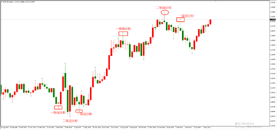 分形点所在的位置,往往是重要的阻力位和支撑位,一旦被突破,则可以顺理成章的入场交易。不过,在分形点当中也存在分级。大部分分形点都属于一级分形点,少部分分形点为二级分形点。